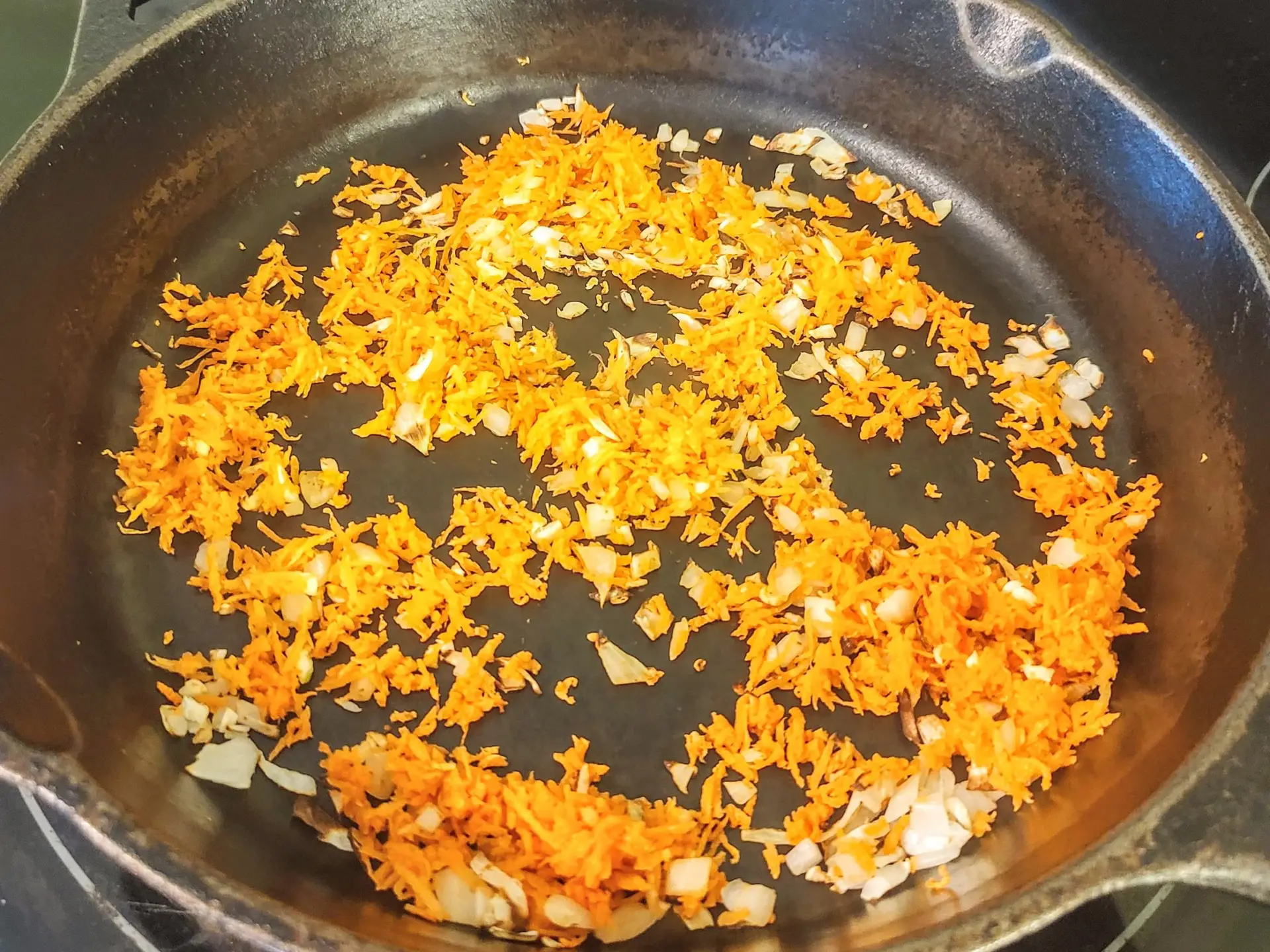 - Heat a large non-stick or cast-iron skillet over medium high heat. Add the onions and reduce the heat to medium. Allow the onions to cook for 3-4 minutes, stirring occasionally. Add some vegetable broth, a teaspoon at a time if needed to keep the onions from burning. Add the garlic and saute for another 3 minutes. Add the shredded carrots and cook another 2-3 minutes.