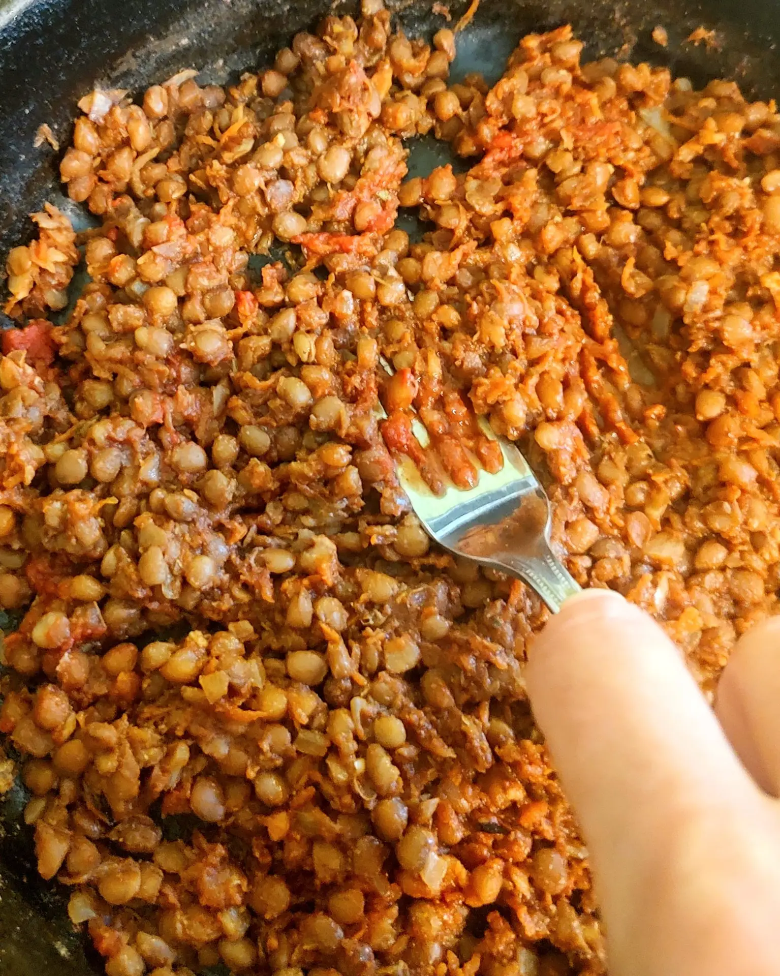 Using the back of a fork, mash about 1/3 of the lentils until the texture is similar to ground meat.